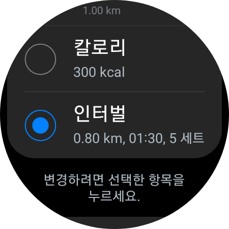 먼저 운동1을 터치하면 거리와 시간 중 하나를 선택해서 정도를 정할 수 있습니다.
