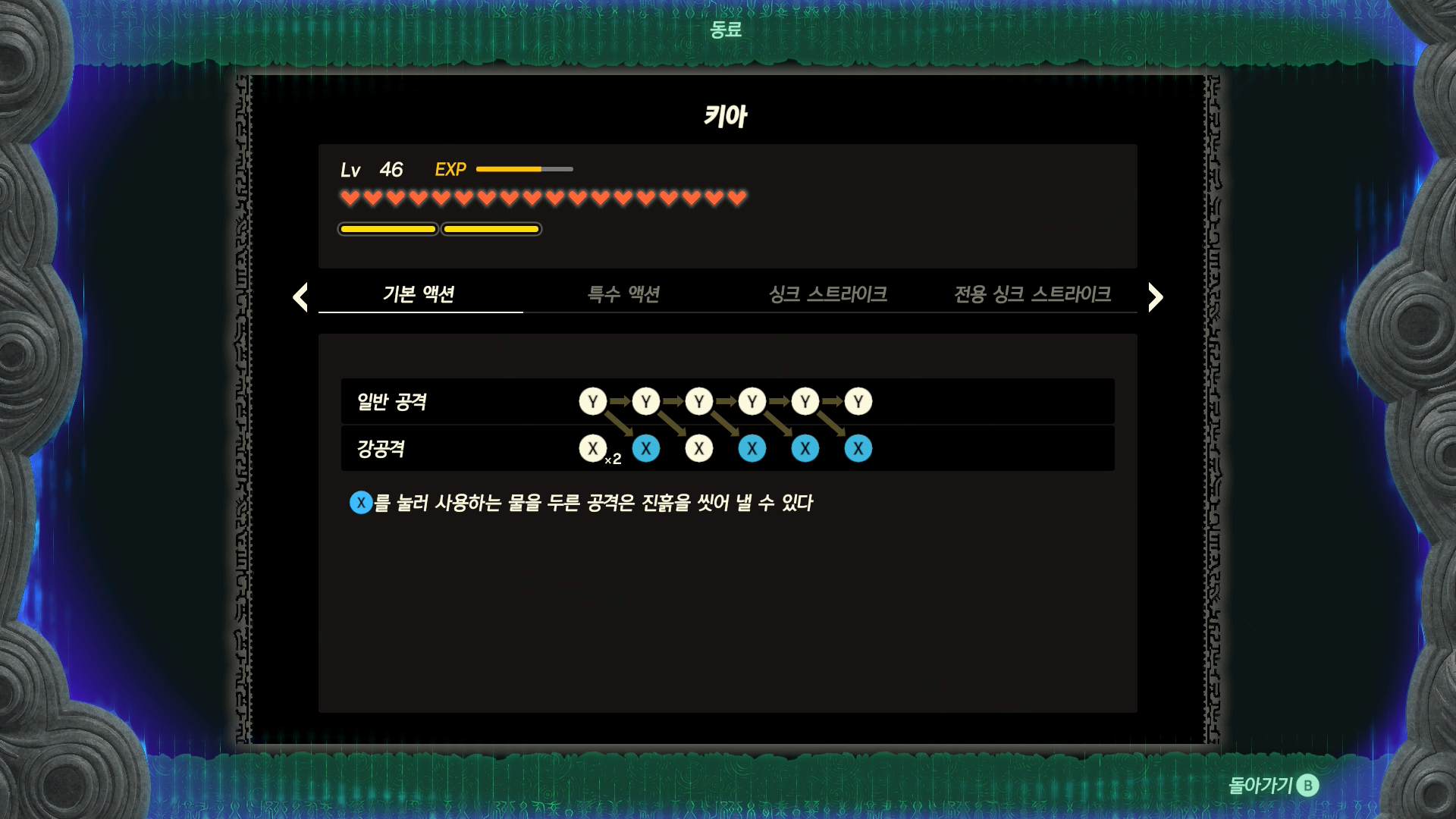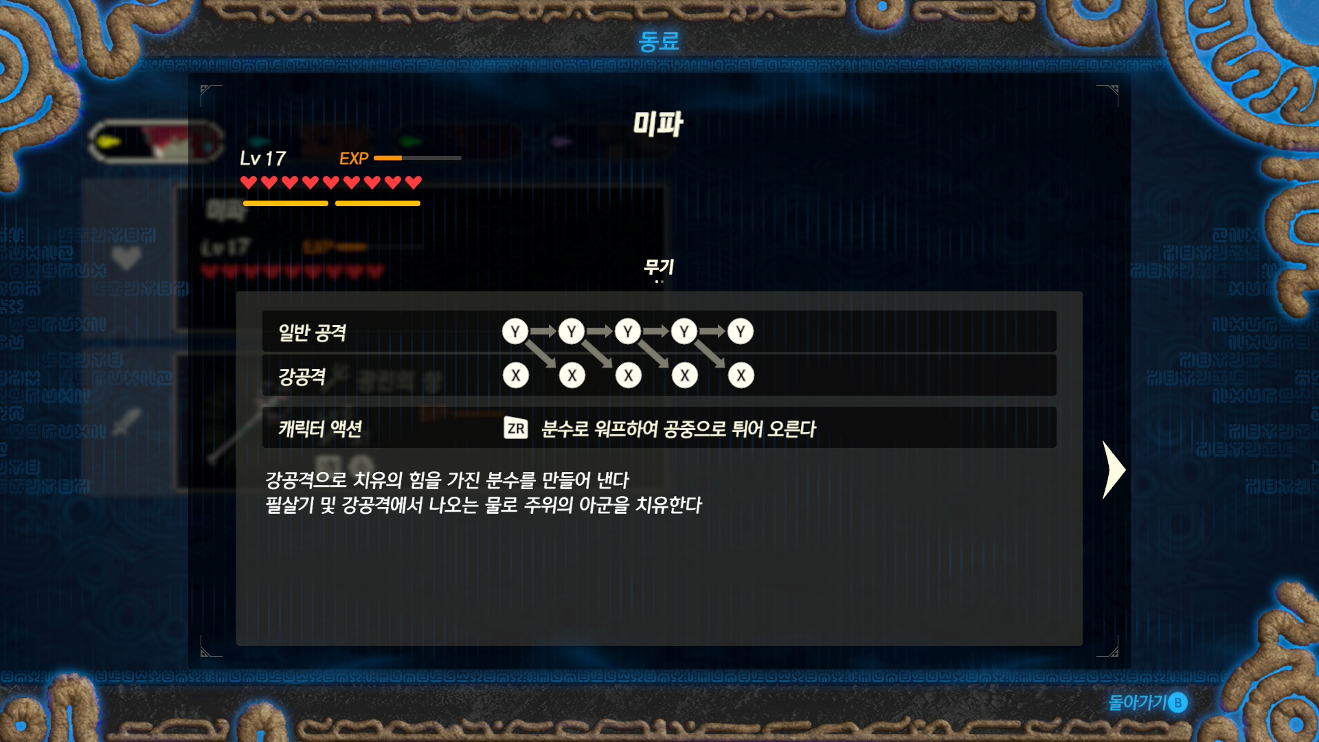 링크는 활쏘기, 젤다는 시커 아이템 반응, 리발은 비행, 미파는 분수 설치, 다르케르는 마그마 폭발, 우르보사는 번개 게이지 모으기 같은 식으로 전혀 다른 조작을 유도하는 좋은 장치였거든요.