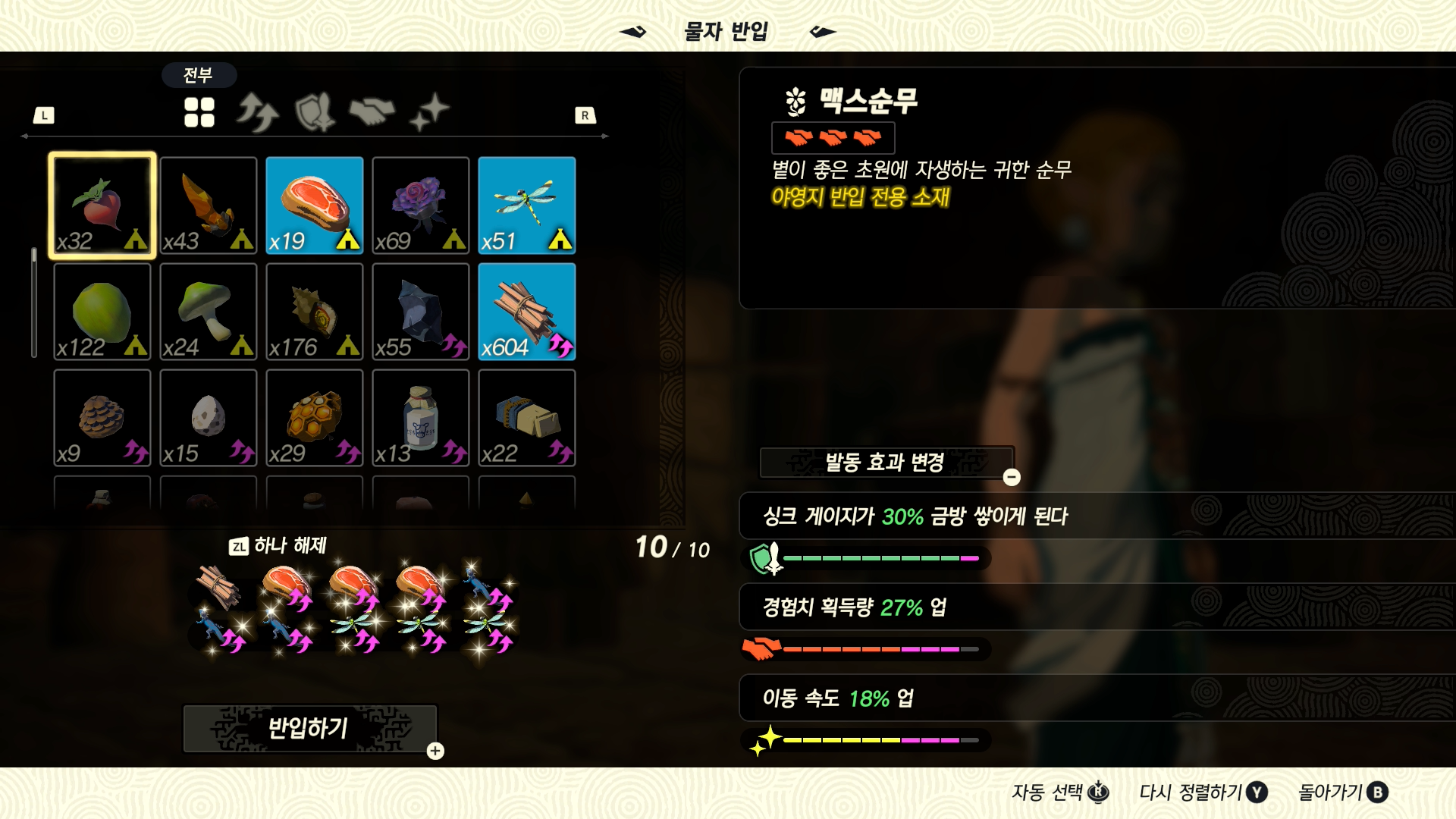 그게 아니면 고기와 벌레를 강화 시켜주는 장작을 선택했을 때 고기와 벌레에 하이라이트 효과를 줘서 한 눈에 알아보게끔 만들어줬어도 좋았을텐데 말이죠.