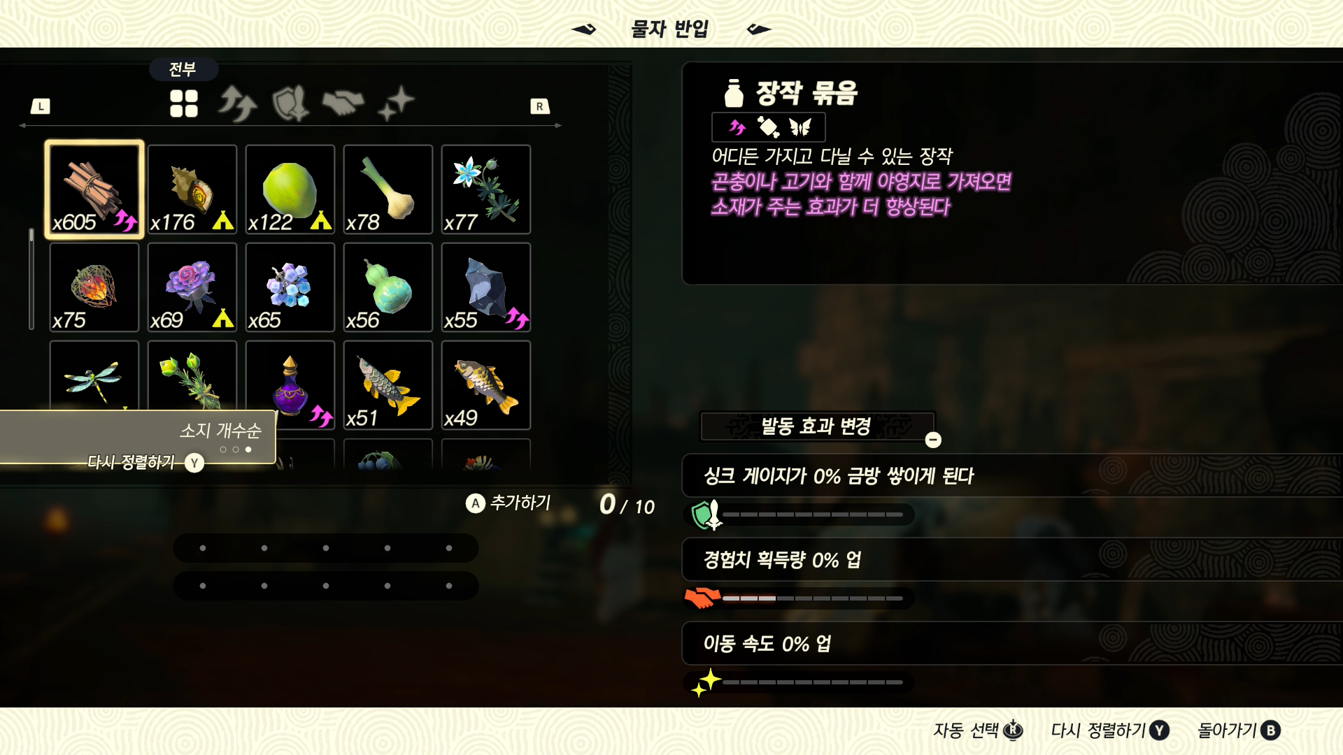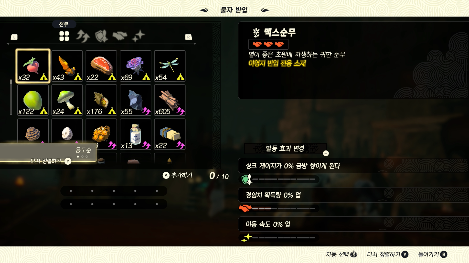 그래서 예를 들면 교전 카테고리 안에서 고기는 고기끼리, 야채는 야채끼리 같은 식으로 정렬이 되면 참 편할텐데 그게 안돼서 익숙해질 때까지 하나하나 찾아다녔었네요.