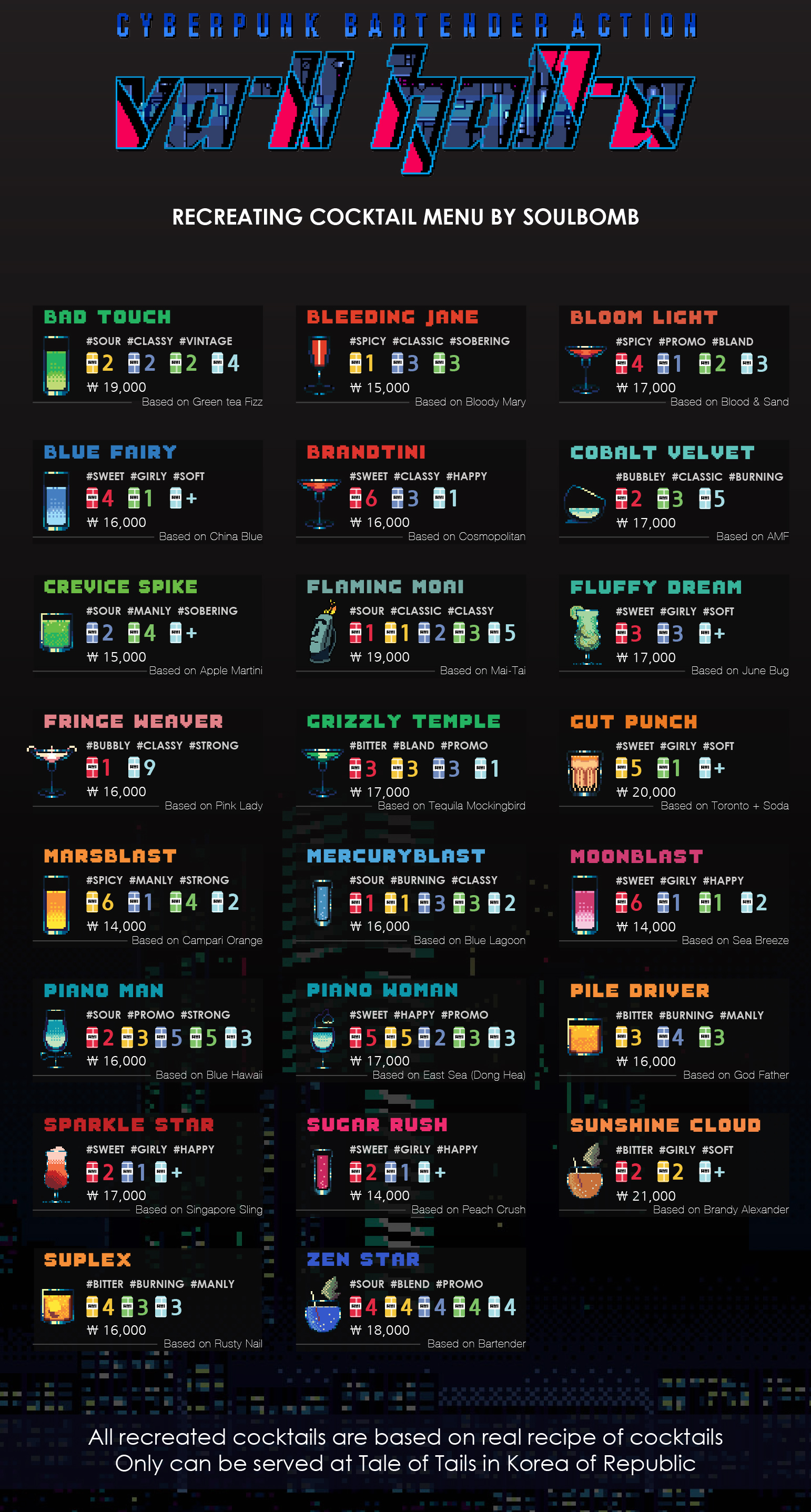 칵테일 기록장/VA-11 HALL-A VA-11 Hall-A menu / 발할라 메뉴 SoulbomB 2026. 2. 23. 22:49 728x90 반응형 2026년 기준 새로운 가격표입니다. 아무래도 물가와 주류 가격이 상승해서 가격이 올라간 것도 있지만 다행히 저렴해진 것도 있네요. 728x90 반응형 공유하기 게시글 관리 SoulbomB 저작자표시 비영리 변경금지 (새창열림) '칵테일 기록장/VA-11 HALL-A' Related Articles 발할라 메뉴판 갱신했습니다. [게임 칵테일 재현 프로젝트] VA-11 HALL-A_23 | END : Zen Star [게임 칵테일 재현 프로젝트] VA-11 HALL-A_22 : Suplex [게임 칵테일 재현 프로젝트] VA-11 HALL-A_21 : Sunshine Cloud